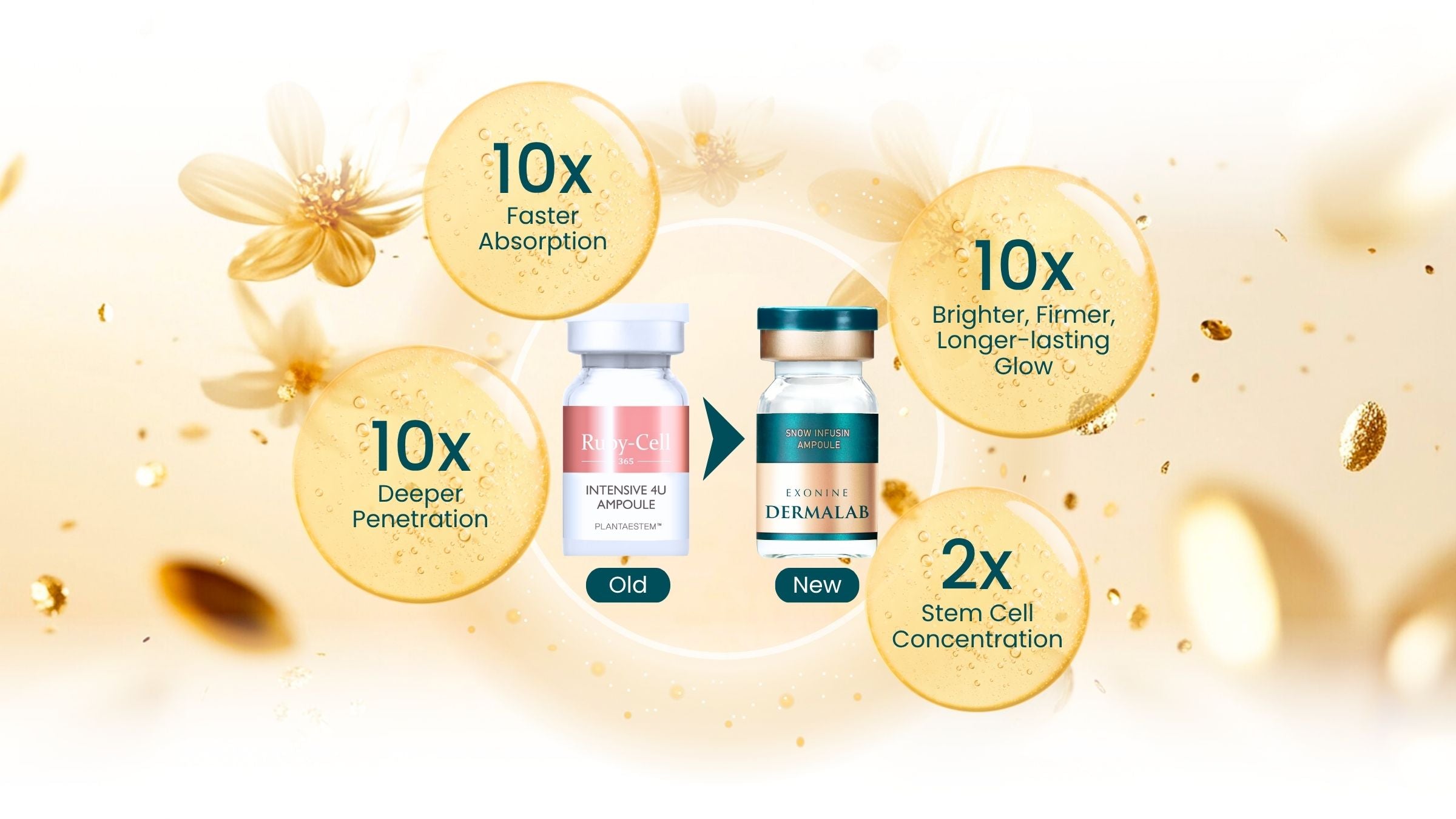 The EXONINE DERMALAB Snow Infusin Ampoule represents a major evolution from the INTENSIVE 4U Ampoule, introducing advanced Exosome technology to elevate absorption, penetration, and overall efficacy. The addition of Exosomes allows active ingredients to reach deeper layers of the skin, delivering 10x faster absorption, 2x stem cell concentration, and 10x deeper cellular penetration, resulting in 10x brighter, firmer, and longer-lasting radiance as compared to using the INTENSIVE 4U Ampoule.