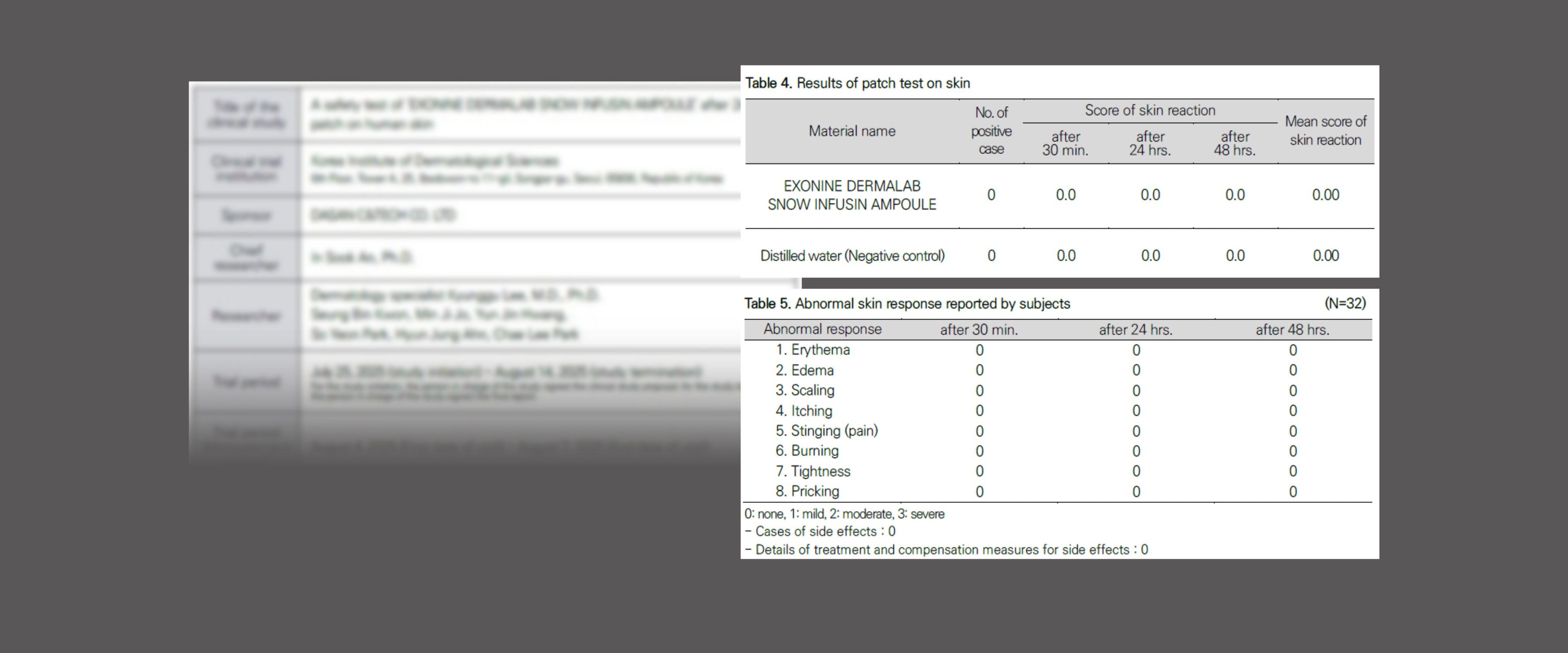 The EXONINE DERMALAB Snow Infusin Ampoule underwent a skin irritation test to ensure its safety for human use. Following the International Contact Dermatitis Research Group standards, skin reactions were evaluated at 30 minutes, 24 hours and 48 hours after application. No irritation or adverse reactions were observed, resulting in a mean score of 0.00, confirming that the ampoule is non-irritant and safe even for sensitive skin.