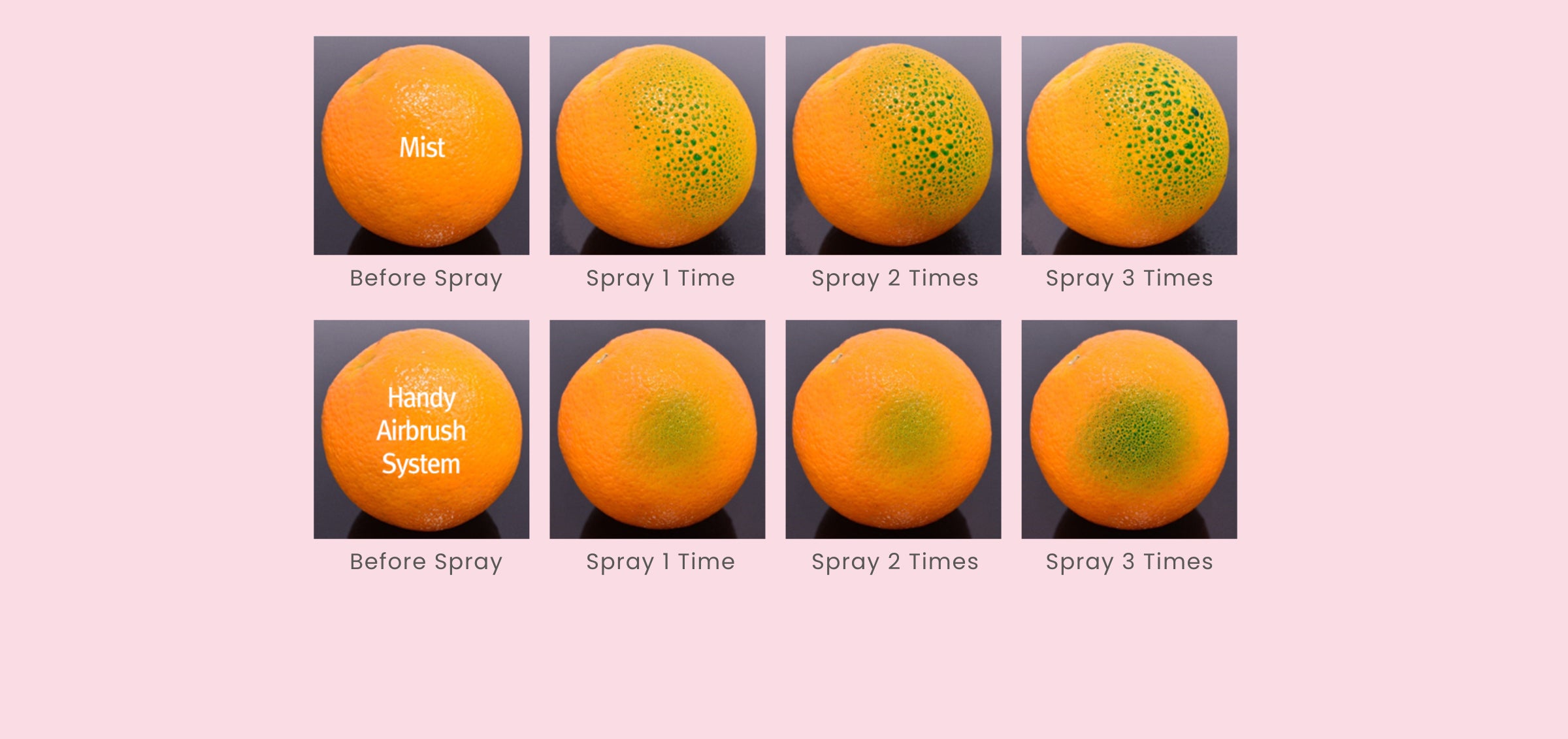 The Handy Airbrush delivered a finer, more even mist with controlled force, ensuring optimal absorption and reduced wastage of the ampoule solution. The consistent spray pressure also prevented uneven coverage, enhancing the overall skincare application. In contrast, a normal mist spray showed uneven dispersion and lacked the precision required for efficient skin hydration and nourishment.
