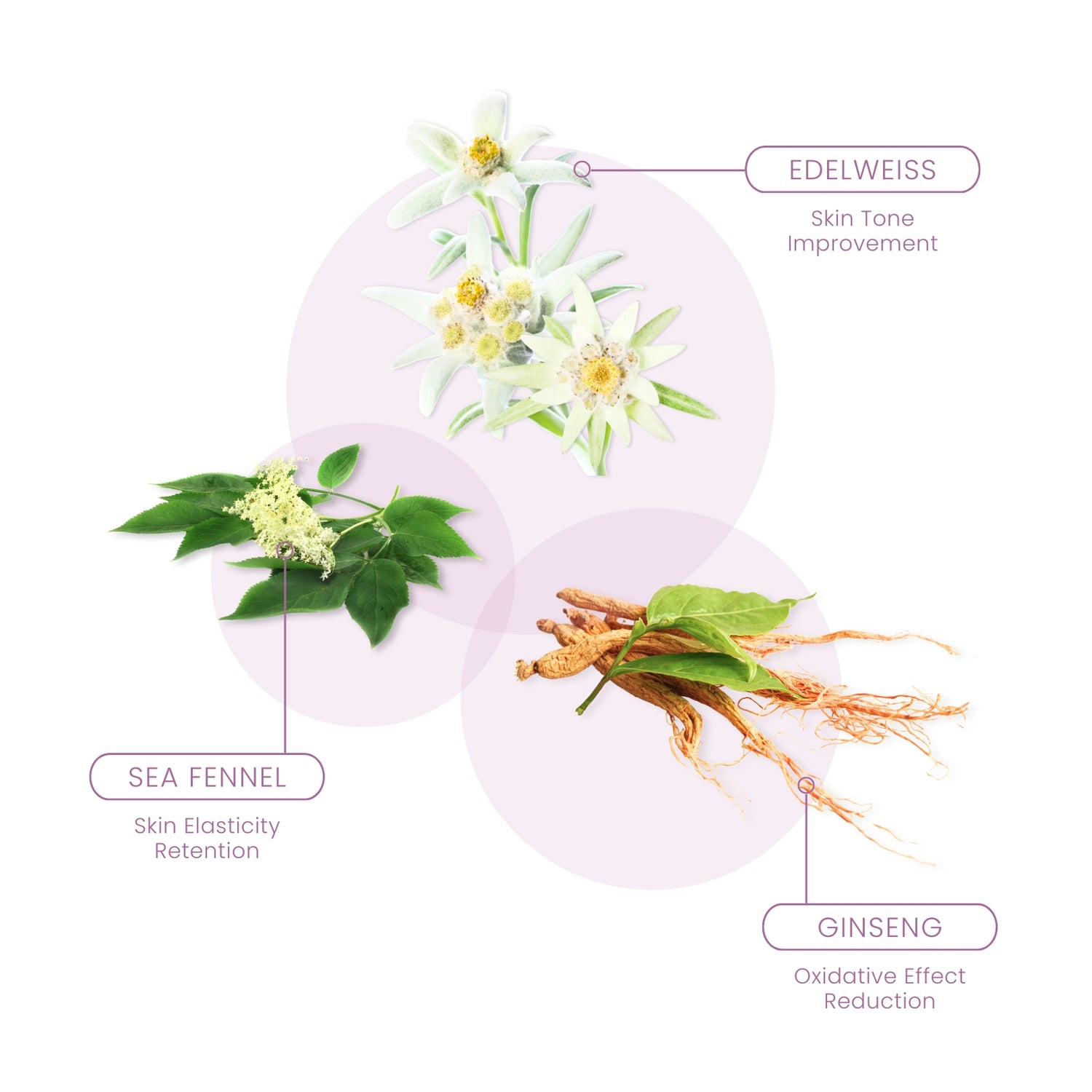 EDELWEISS: Improves skin tone and prevents darkening by inhibiting melanin synthesis